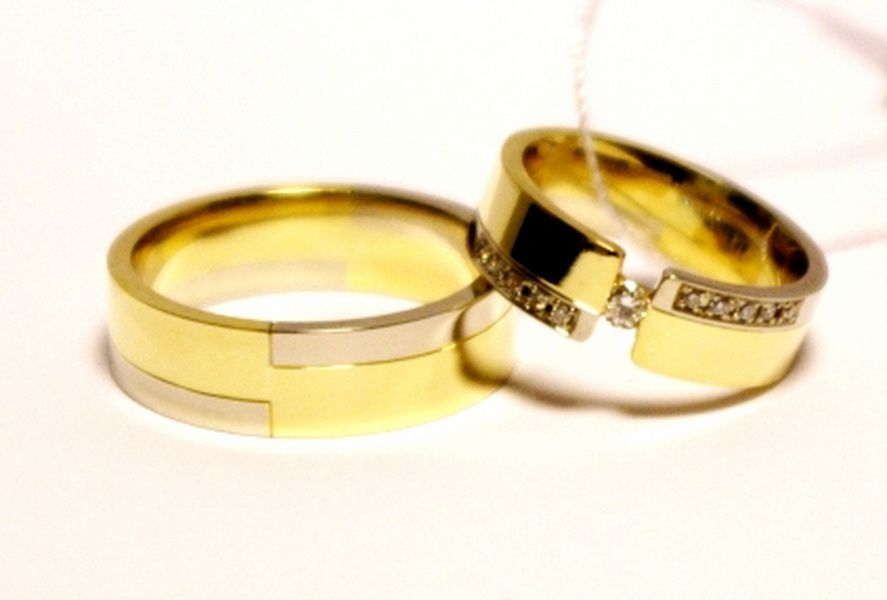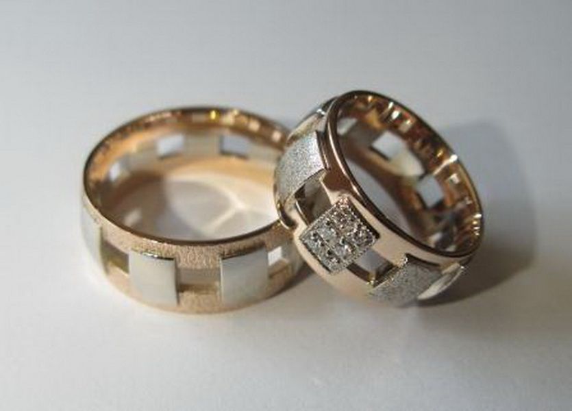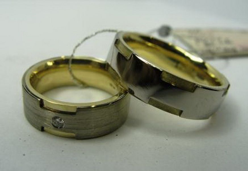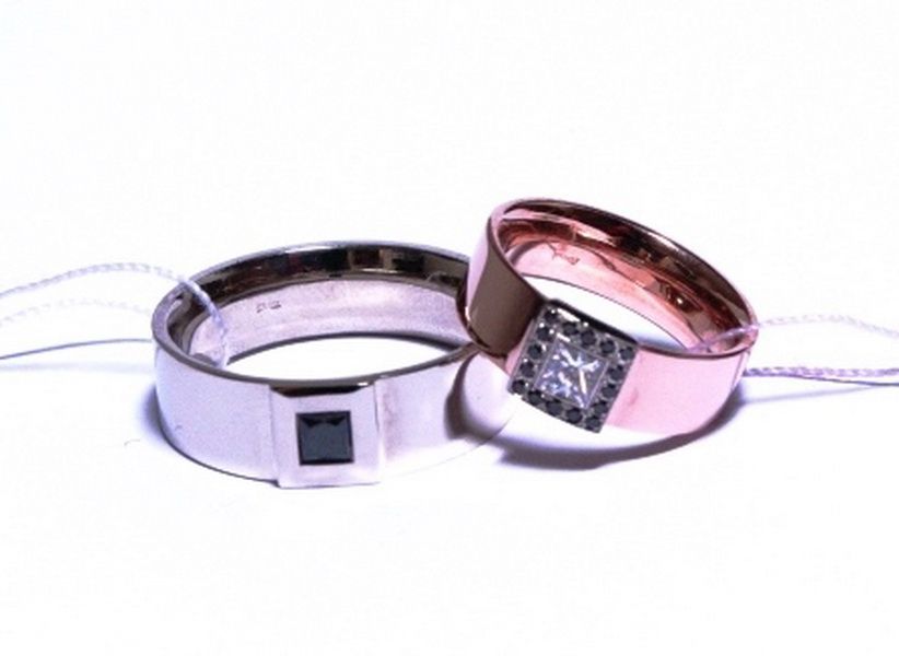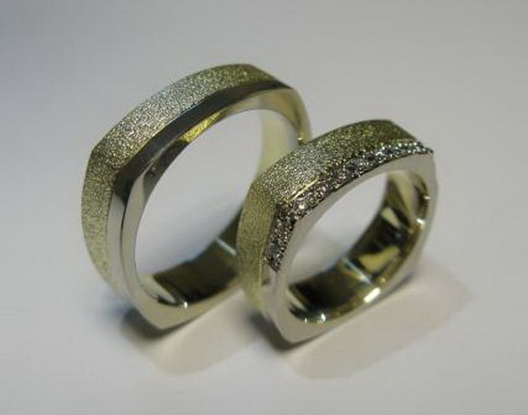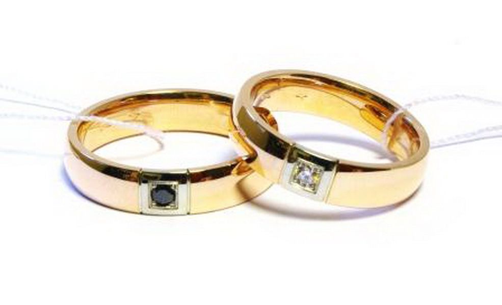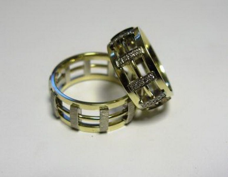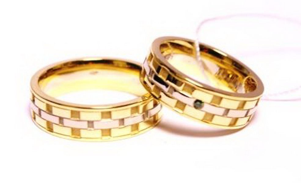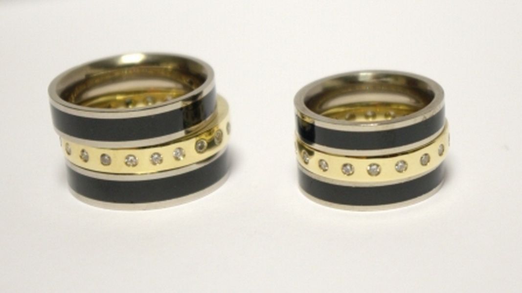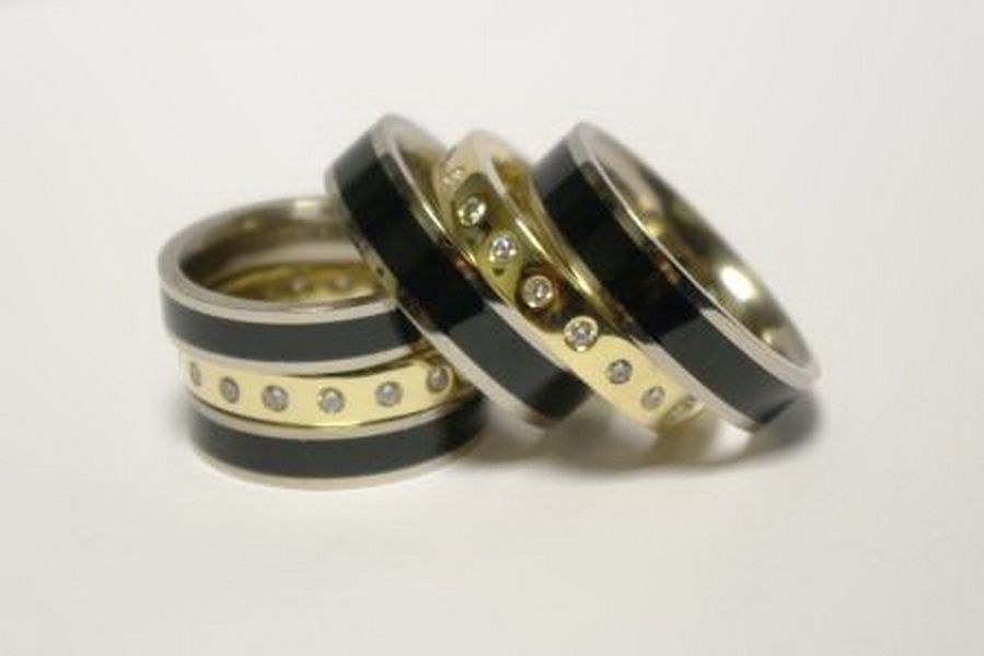 - Vestuviniai ziedai Nr.170 (is skirtingu spalvu aukso, puosti juodu ir baltu kvadratiniais deimantais)